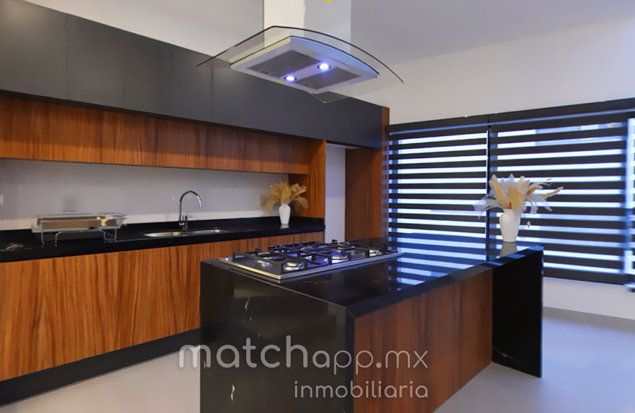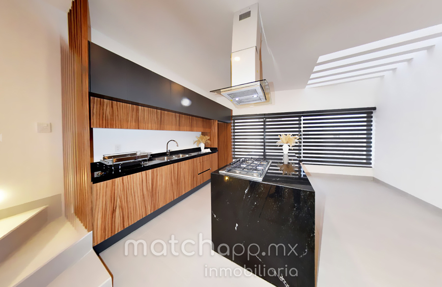 En Planta media:Entrada con puerta amplia (madera de Tzalam natural), Estancia bien iluminada persianas verticales en todas las ventanas, Cocina integral gabetas amaderadas y cubiertas de granito vía lactea